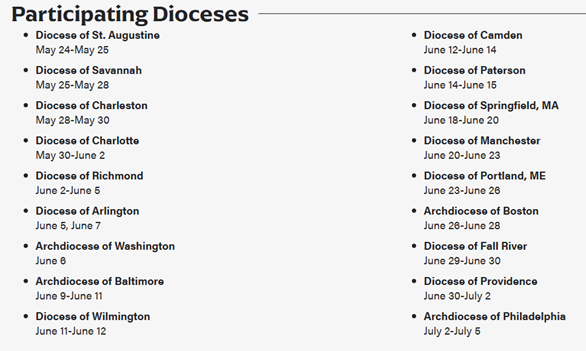 With the theme “One Nation Under God”, the pilgrimage celebrates our nation’s 250th year with an invitation to build unity through prayer, and to let Jesus, present in the Eucharist, renew and heal the heart of our country, one soul at a time (NEP). The pilgrimage will travel the eastern seaboard of the United States beginning in St. Augustine, Florida and concluding in Philadelphia, PA. The Archbishop said, “The National Eucharistic Pilgrimage is a blessing at a critical moment in the life of our nation. The Church, through this pilgrimage, is a resource of prayer and adoration. We will join in prayer and Eucharistic adoration and we pray that Jesus truly present in the Eucharist may renew the heart of our country.” From Memorial Day 2026 through July 5, the Pilgrimage will include daily Mass, walking processions, Eucharistic adoration, witness talks and service projects. The pilgrimage will pass through most of the thirteen original colonies with stops in eighteen dioceses. Pilgrims will carry the Blessed Sacrament along the route, engaging Catholics in each community. The NEP notes that: The pilgrimage begins over Memorial Day weekend in St. Augustine, Florida, where the first Mass in our country was celebrated at the Our Lady of La Leche Shrine at Mission de Nombres. The route will continue up the Eastern Seaboard through most of the thirteen original colonies, reaching as far north as New Hampshire and Maine. Stops will be made in the Archdiocese of Baltimore, our country’s very first Catholic diocese, as well as the Archdiocese of Boston to visit significant national historical sites. The pilgrimage concludes over the 4th of July weekend in Philadelphia, in honor of the 250th anniversary of the Declaration of Independence. Boston Visit The Archdiocese is finalizing the locations during the June 26-28 visit. All of the locations will have historical significance in the founding of our country. Among the expected stops will include Plymouth, Charlestown, and Lexington. A procession will take place from a centralized gathering place in Boston to Charlestown. A vigil Mass is being planned on Saturday, June 27 at the Cathedral of the Holy Cross. Check back over the weeks ahead to learn the exact locations, times and dates for the Pilgrimage. To learn more and for updates, visit www.eucharisticpilgrimage.org. Into the Deep 2027 Inspired by the 2024 National Eucharistic Congress, in 2025 Archbishop Richard Henning sought to create an experience of encounter with the Eucharist for the people of the Archdiocese of Boston through Into the Deep. When it became known that the 2026 National Eucharistic Pilgrimage would include eastern Massachusetts, the decision was made to hold the next Into the Deep encounter in 2027 along the coast of the South Shore in Massachusetts. To stay informed about Into the Deep 2027, click here. Archbishop Henning invites all those originally intending to participate in Into the Deep 2026 to join the National Eucharistic Pilgrimage as it passes through several historic locations in our archdiocese this summer. He looks forward to making his way down the coast of the South Shore in 2027!